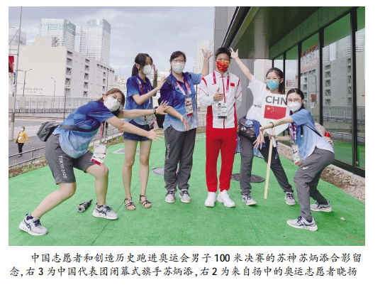 出发之前,5名中国籍志愿者和创造历史跑进奥运会男子100米决赛的苏神苏炳添合影留念。